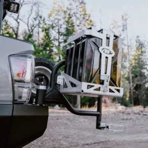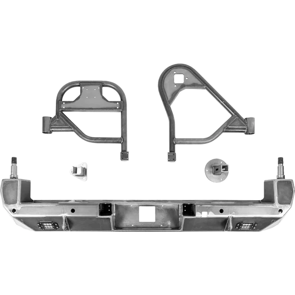 The right-side arm can accommodate an oversized spare up to 37″ while the left-side arm offers numerous storage options, like our fully compatible Swing Out Bumper Ice Chest Holder (see RELATED PRODUCTS down below). This kit includes the bumper with integrated rear-facing LED lights, the spare tire swing-out arm, spare tire mount, and the accessory swing-out arm along with all installation hardware. This bumper is available in bare steel or a durable black powder coat. Although this bumper comes fully sanded and ready for paint, the mill scale will vary depending on the lot.