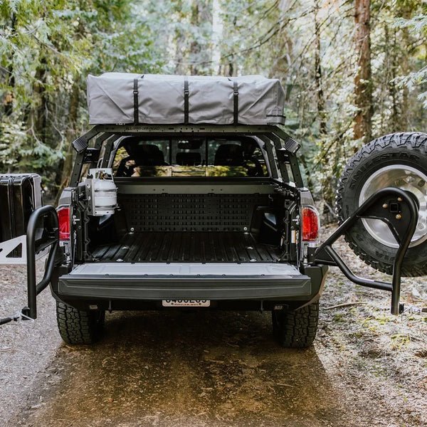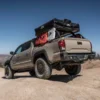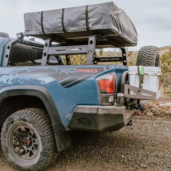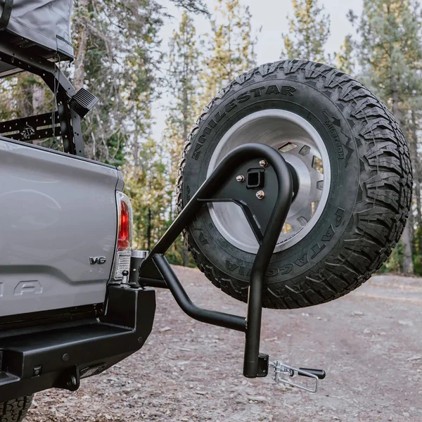 2016-Current Tacoma Dual Swing Out Bumper All-Pro’s 2016-Current Tacoma Dual Swing Out Bumper combines an aggressively styled high-clearance bumper with space-saving storage for your spare tire and extra gear. Free up valuable storage space without sacrificing bed accessibility. All-Pro’s Dual arm design dramatically decreases the clearance radius required, virtually eliminating the chance of interfering with anything you may have in tow. Each arm has (2) open locking positions at 90-degrees and 135-degrees. The modular bolt-together system requires no welding for installation.