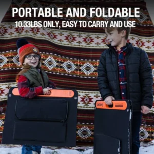 DURABLE SOLAR PANEL: The panel has a folding design with a TPE rubber handle and weighs only 9.1 lbs (4.13kg). Convenient to carry it wherever you go. Adjust the angle with the built-in supporting stand. Made from durable PET material, high-temperature resistant.