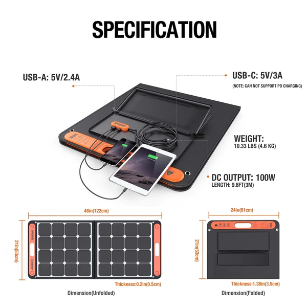 SolarSaga 100-Watt Portable Solar Panel for Explorer 290/550/880/1000/1500 Power Station with Built-in 2 USB Outputs