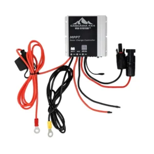 – Optional Plug-and-play MPPT solar charge controller. This waterproof unit can be mounted outside and is highly resistant to heat and vibration. It automatically controls how much electricity reaches the battery and prevents overcharging. The charge controller has been pre-wired with fuses, terminals, and connectors to take out all of the guesswork in setting up the VSS System™. Up to 2x 45-watt panels can be wired (in series) into 1 charge controller.