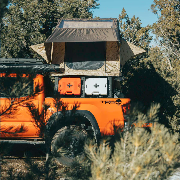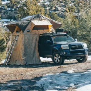Bring the whole family with the Mt. Denali tent, which is designed to sleep ‘four-plus.’ This behemoth features the option to divide the tent into two halves, each with its own door and ladder. This way you can essentially have two tents in one, or keep the whole tent open and snuggle up. Bed Rack Needs to be Roof Rack Height to fit this Roof Top Tent on a Tacoma.