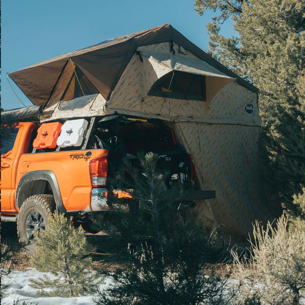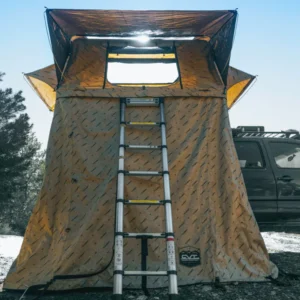 The Mt. Shasta tent is designed for ‘two plus,’ meaning it can comfortably sleep two adults plus a dog or smaller child, especially if you opt for the extended version. It can still easily fit on all trucks, trailers, and SUVs, as well as most cars. An annex adds extra space beneath the tent for changing, cooking, storing gear, or sleeping.