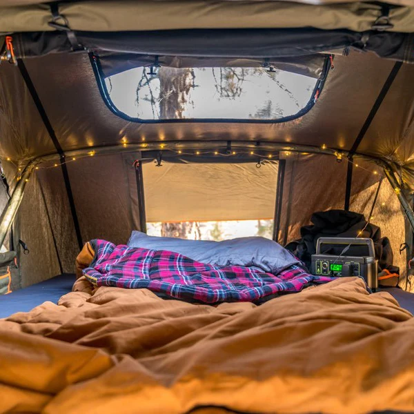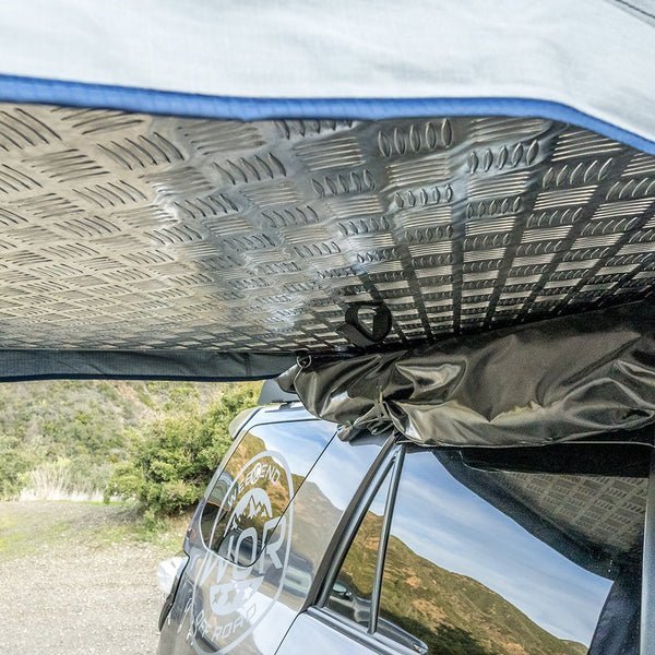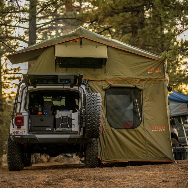 The ROAM Vagabond is a durable foldout rooftop tent that sleeps 3-4 people on top of a high-density foam mattress.