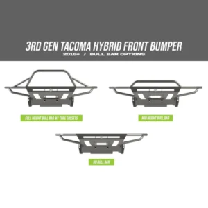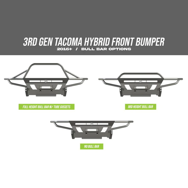 - 2016+ Tacoma (3rd Gen) Hybrid Front Bumper requires cutting of the plastic bumper to install.